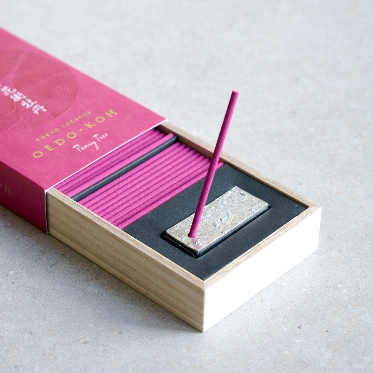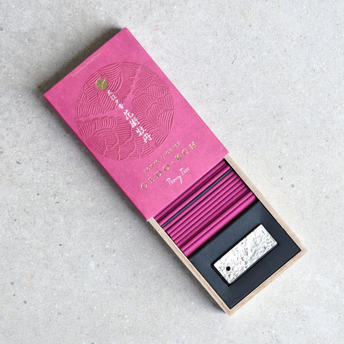 קטורת Peony Tree מגיעה באריזה מעוצבת המעוטרת בתבליט פרח הפאוני וכוללת מעמד ייעודי לקטורת.