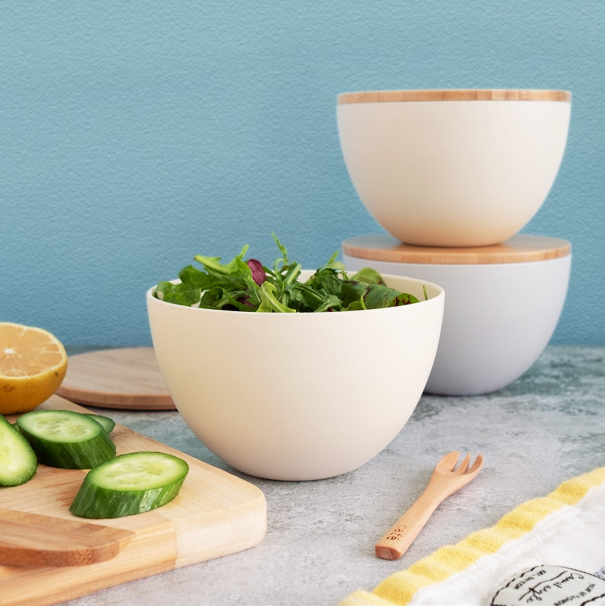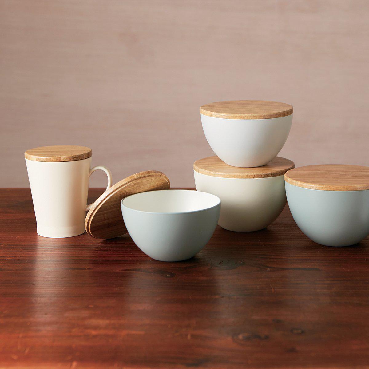 קערית קומפקטית עם מכסה במבוק בעיצוב נקי ומינימליסטי מבית טקנקה.