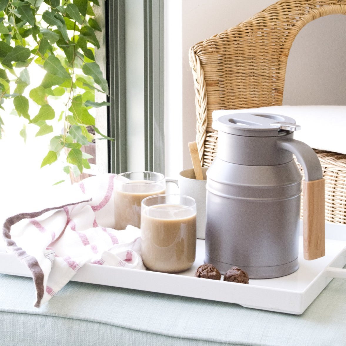 סט המורכב מקנקן תרמי 1 ליטר בצבע מוקה ומגבת מטבח איכותית 100% כותנה לבנה עם פסים ורודים.
