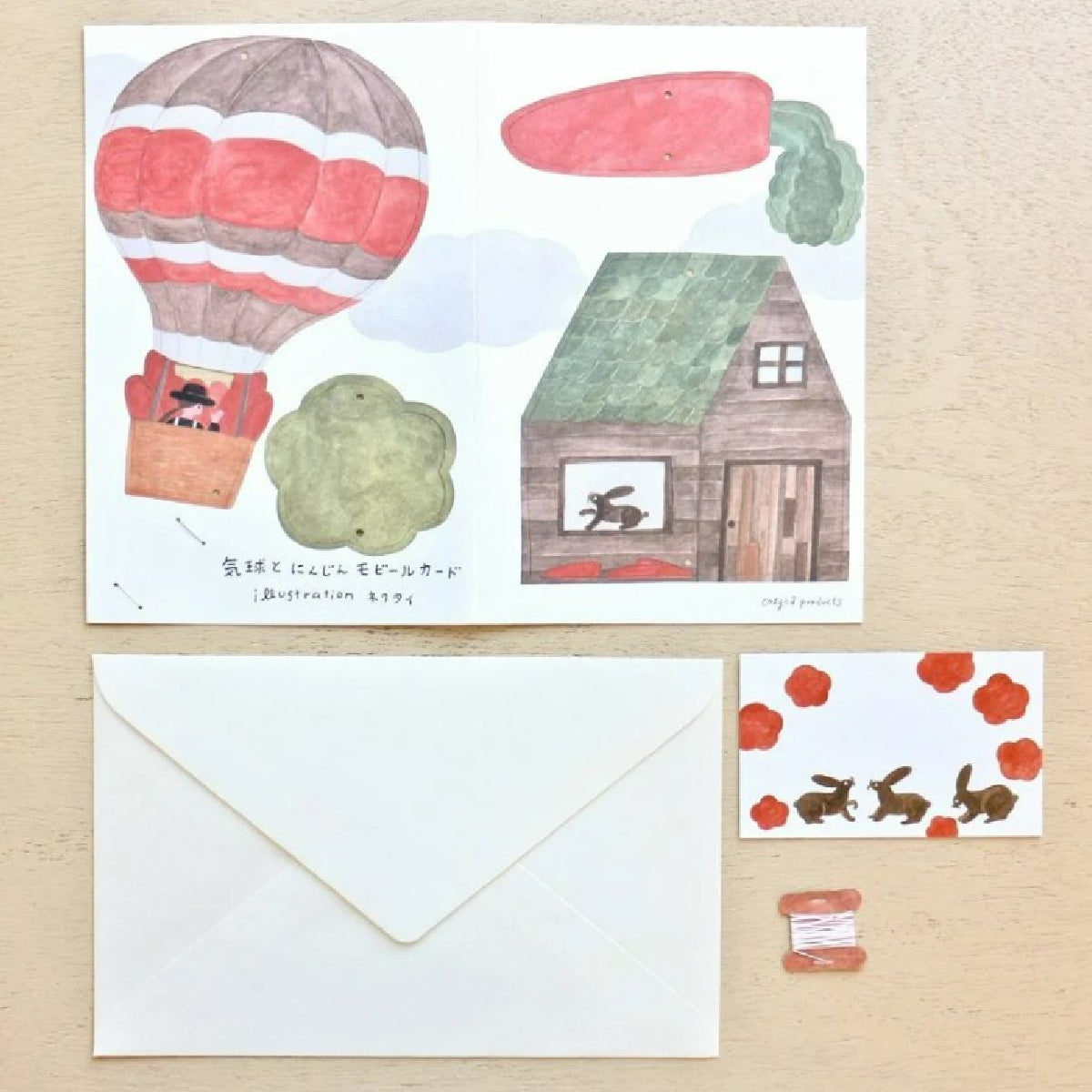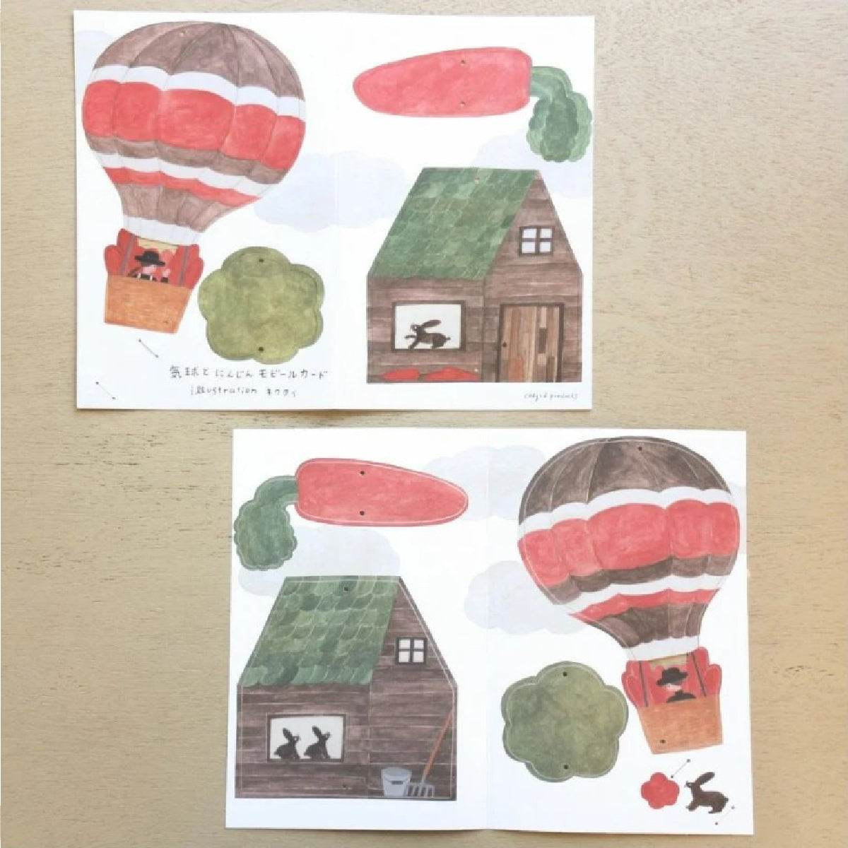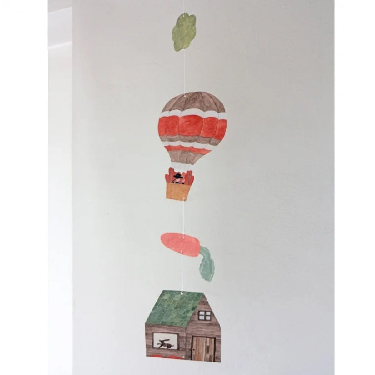 מובייל ייחודי מבית Necktie יפן, עוצב ע"י המאייר היפני Cozyca עשוי נייר יפני איכותי ומעוטר איורים עדינים וקסומים של איש מרחף בכדור פורח, גזר גדול ובקתת עץ עם ארנבונים מציצים מהחלון. האיורים שונים משני צידי המובייל, ומשלימים את חלקו הקדמי והאחורי של התמונה.