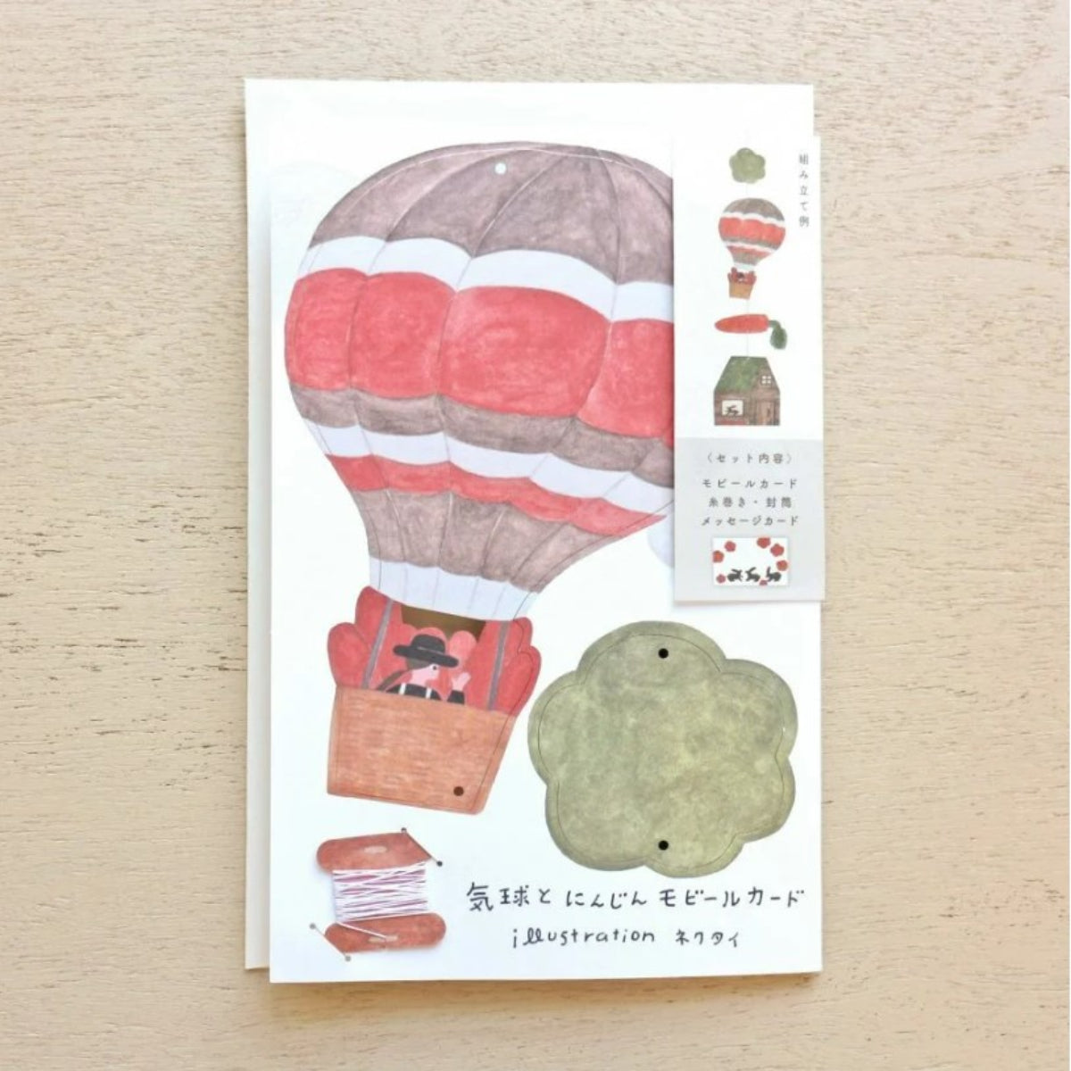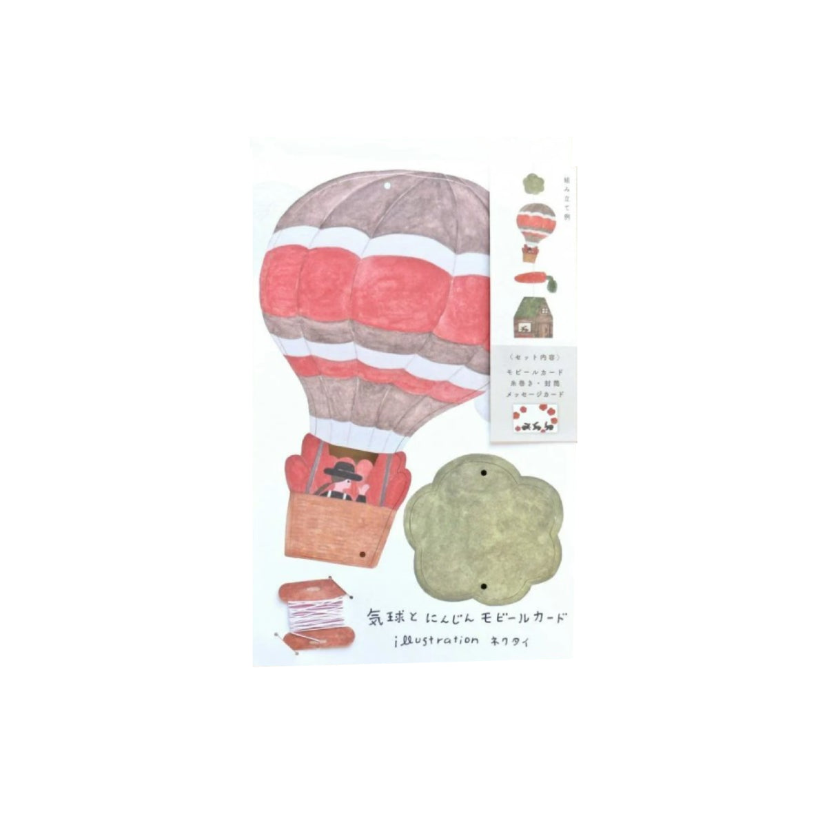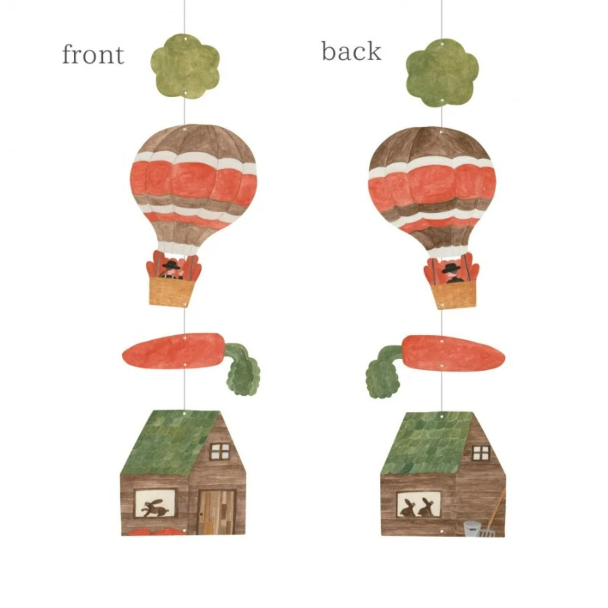 מובייל ייחודי מבית Necktie יפן, עוצב ע"י המאייר היפני Cozyca עשוי נייר יפני איכותי ומעוטר איורים עדינים וקסומים של איש מרחף בכדור פורח, גזר גדול ובקתת עץ עם ארנבונים מציצים מהחלון. האיורים שונים משני צידי המובייל, ומשלימים את חלקו הקדמי והאחורי של התמונה.