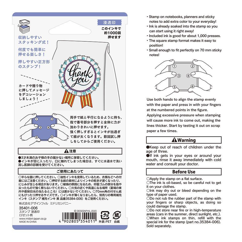 חותמת פלאש איכותית מבית Midori הכוללת דיו מובנה על בסיס שמן, עם החתמה מדויקת באיכות לייזר - ברורה מאוד ואסתטית, קווי מתאר דקים וחדים, וצבע החתמה עז ביותר. הודות לדיו המשובח המבוסס על שמן, החותמת עמידה בפני מגע עם מים. ההחתמה אינה נמרחת, אינה מטפטפת ונשמרת בדיוק כפי שנספגה על הנייר לראשונה. מתאימה לכתיבת משימות ותזכורות, צביעה וקישוט אלבומים ויומנים, כרטיסי ברכה ולכל פרויקט יצירה.