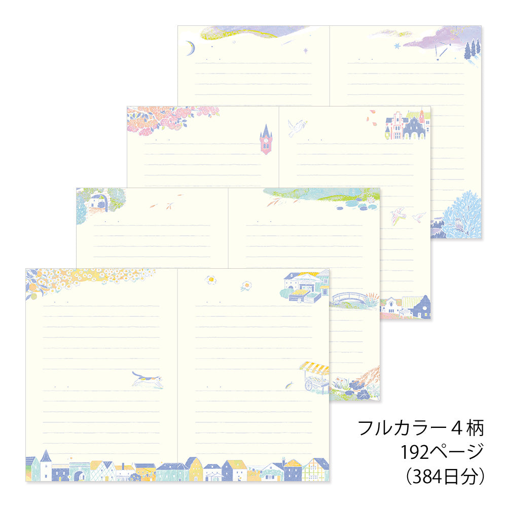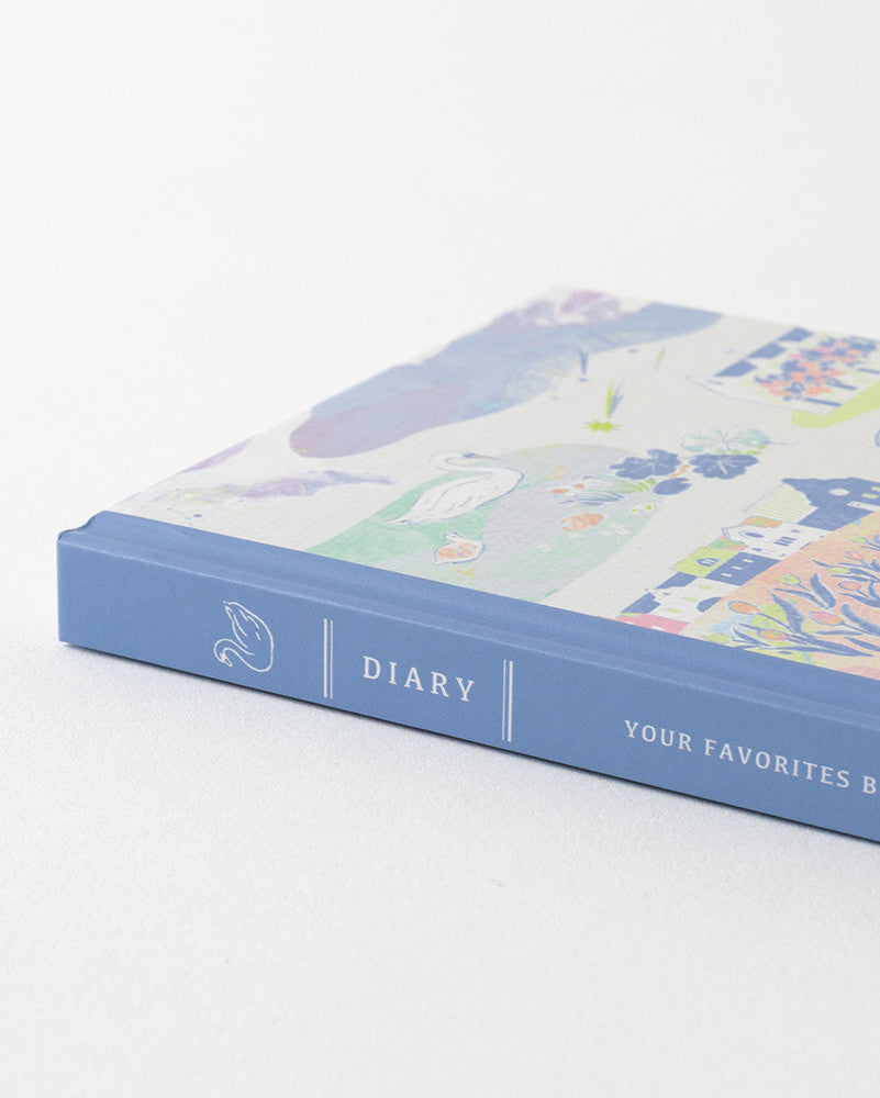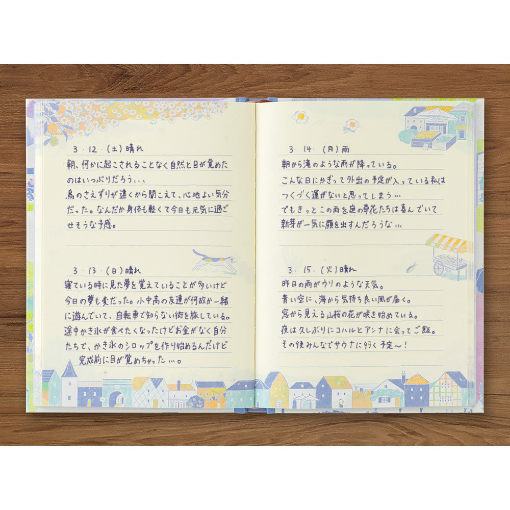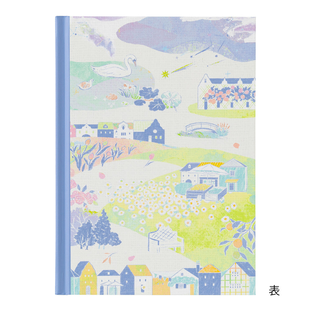 ליומן כריכת בד עבה ואיכותית המעוטרת באיורים מתוקים של עיירה קטנה.