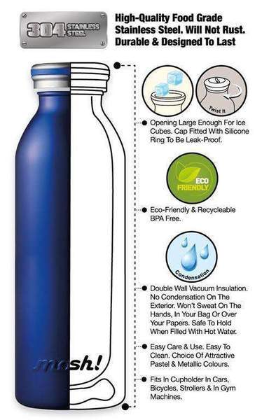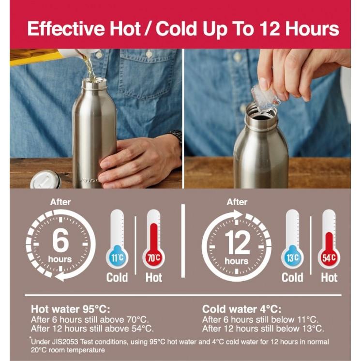 - לבקבוק פיה רחבה המאפשרת שתייה נוחה והכנסת קוביות קרח. דופן הבקבוק כפולה עם בידוד ואקום המונע ריחות וטעמי לוואי, ושומר היטב על טמפ' המשקה