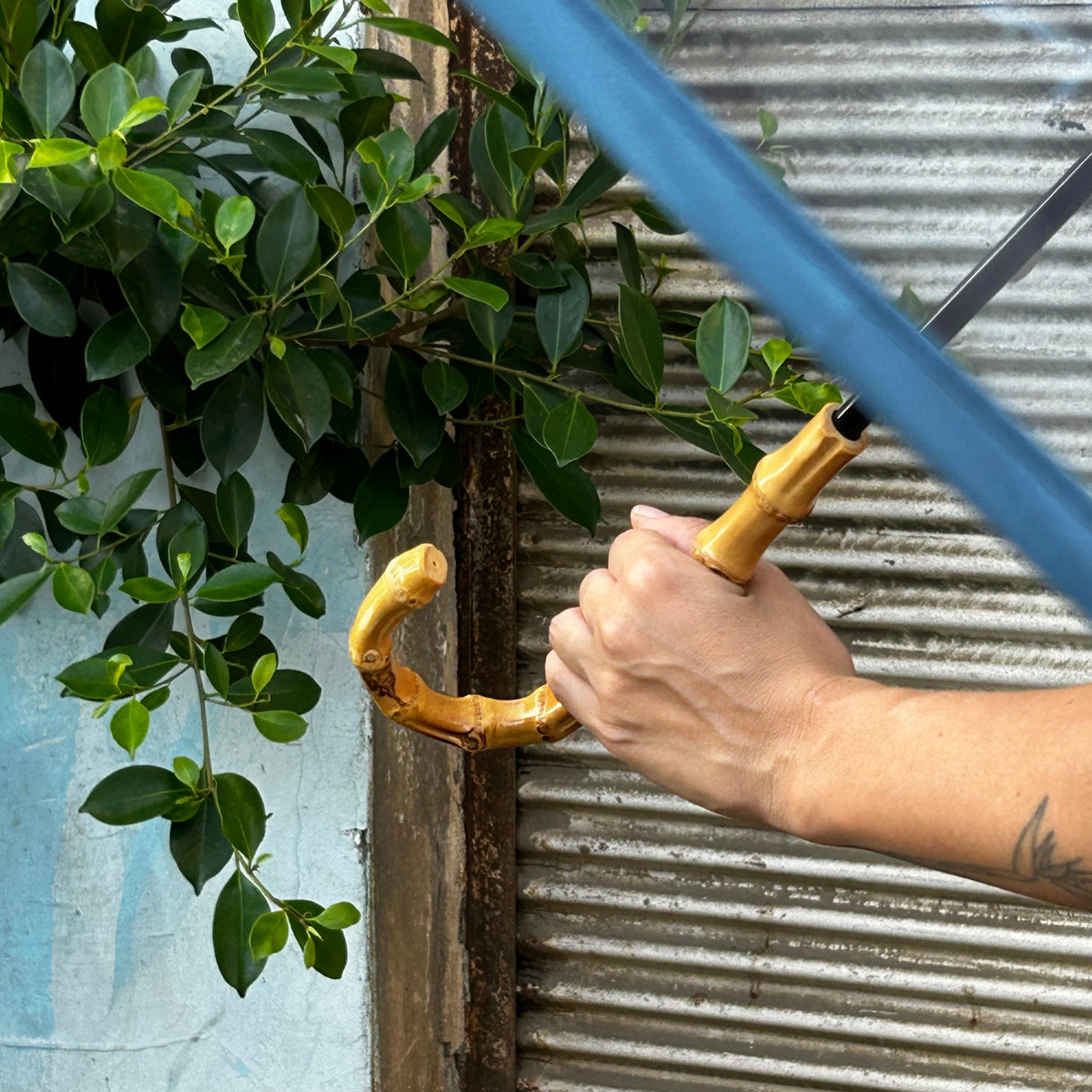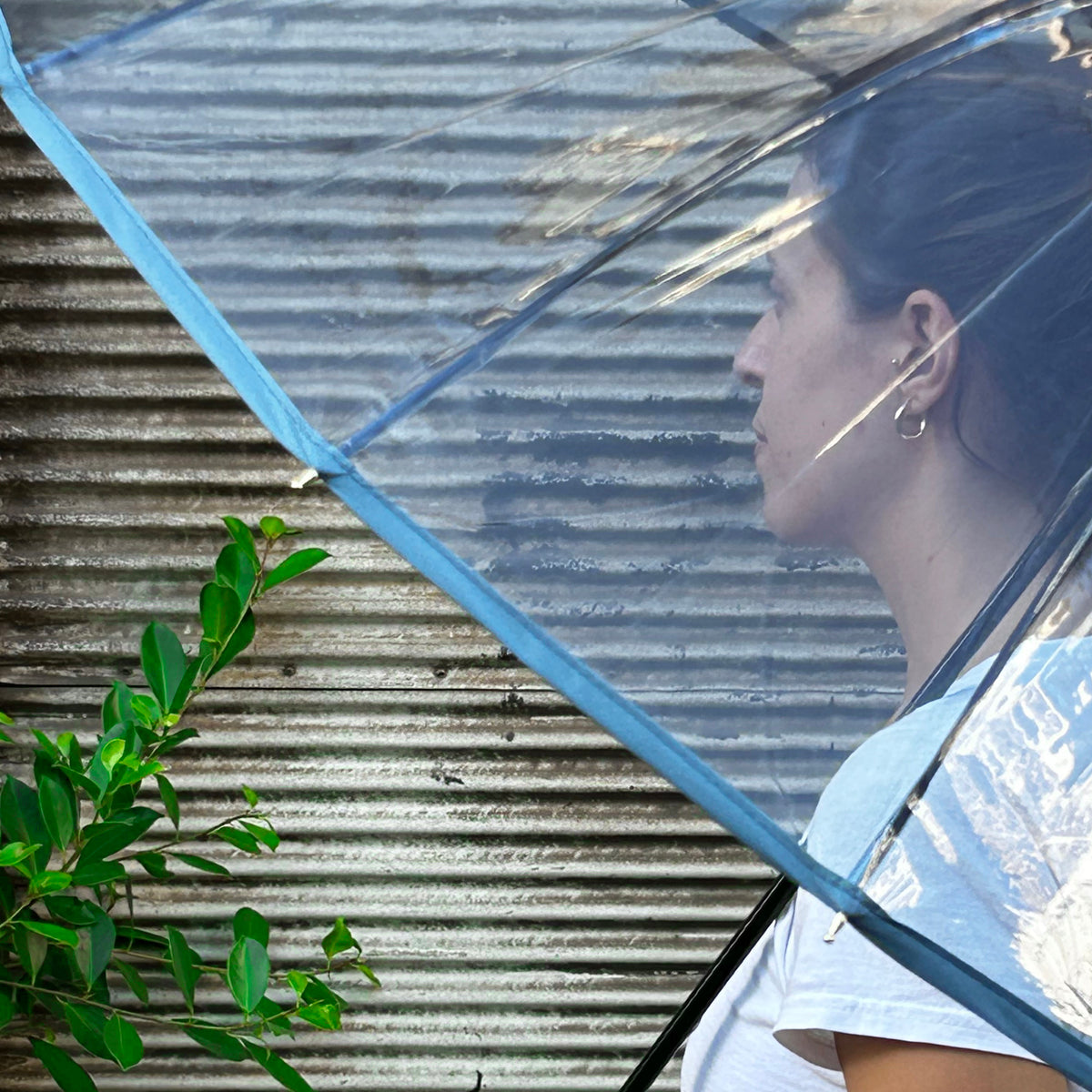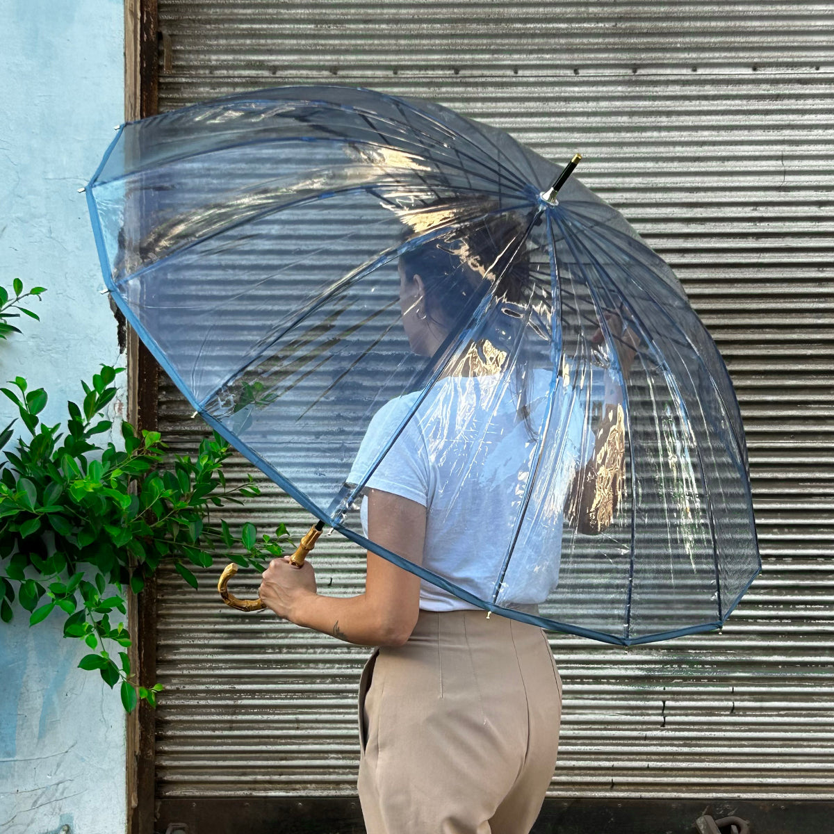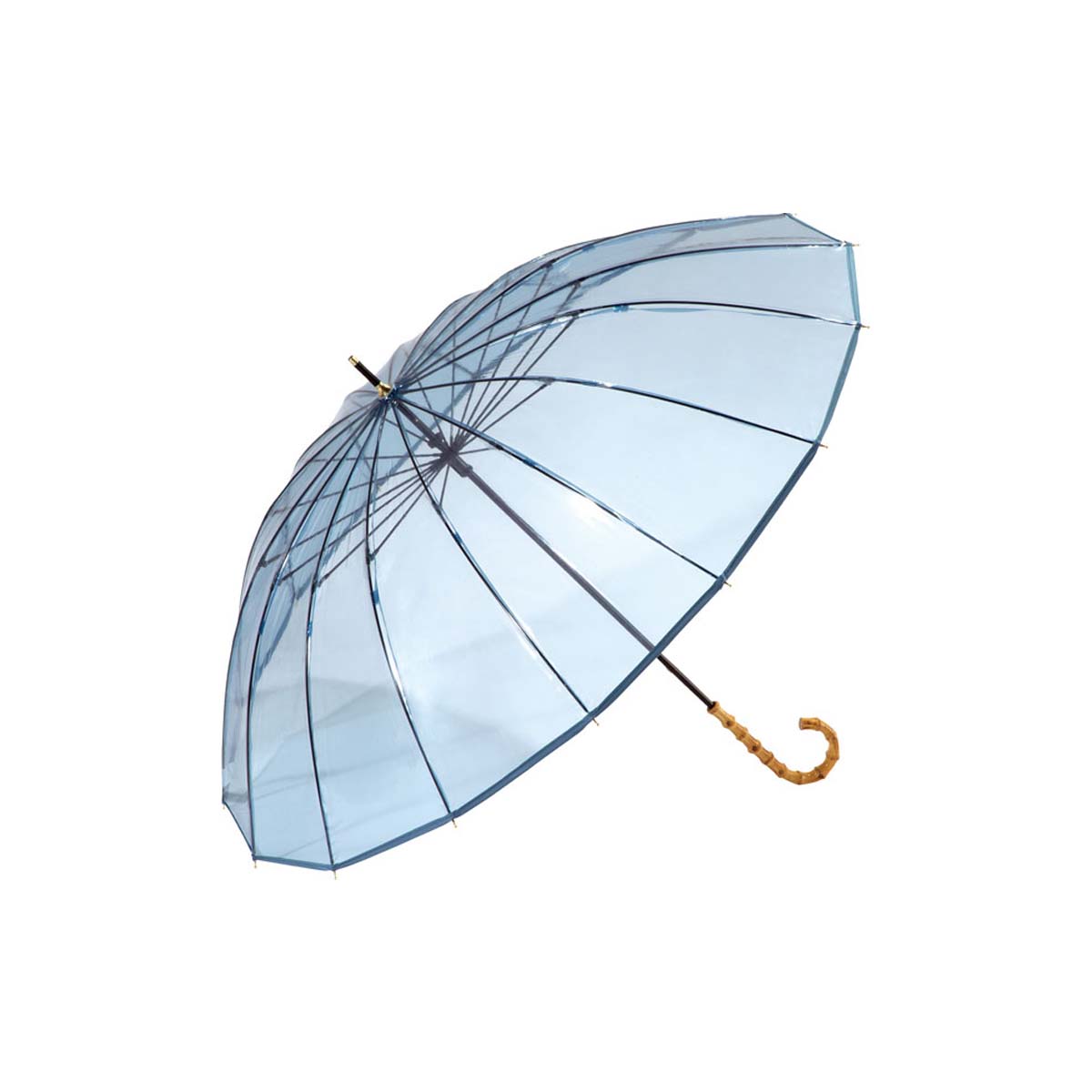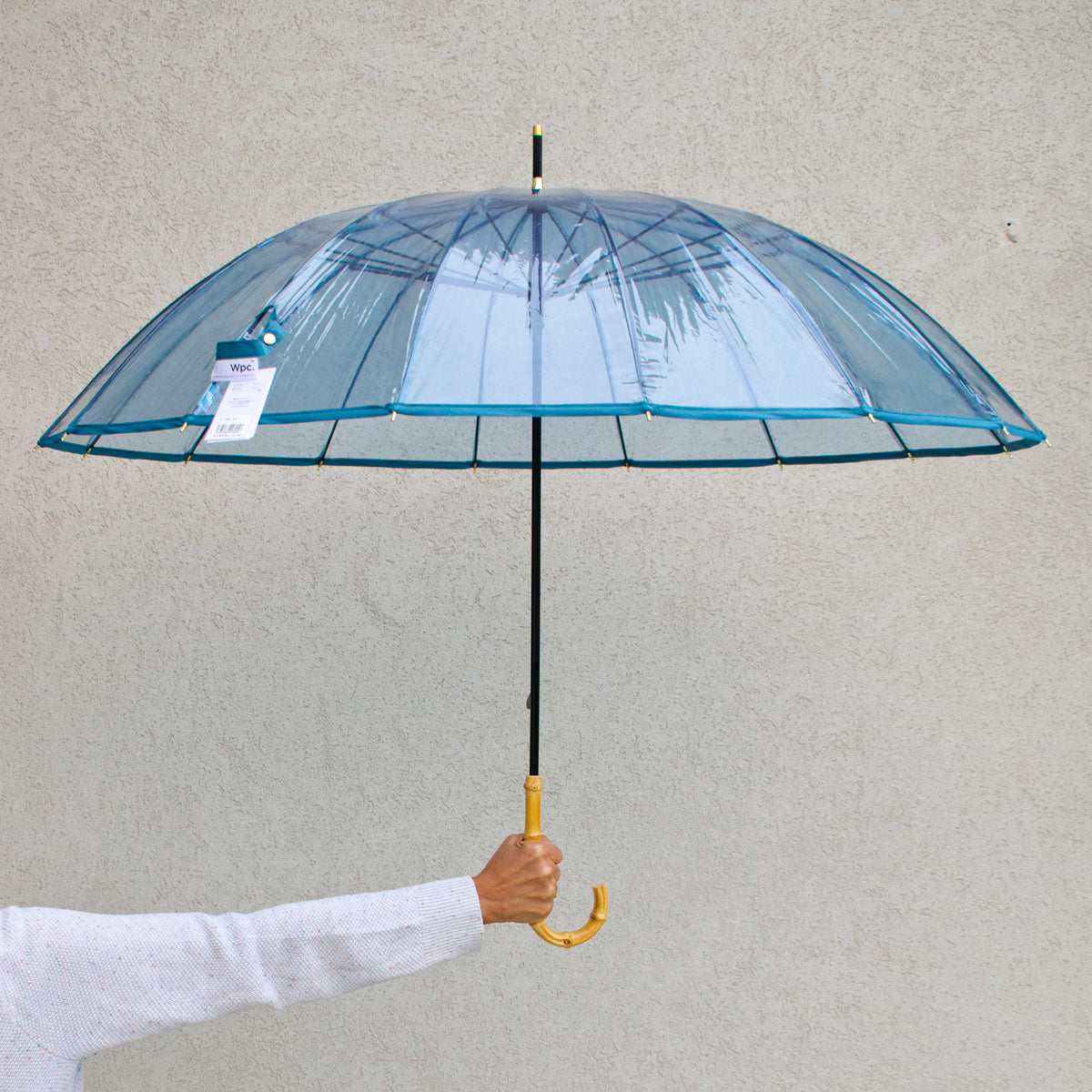 מטריה שקופה ידית עץ - כחול