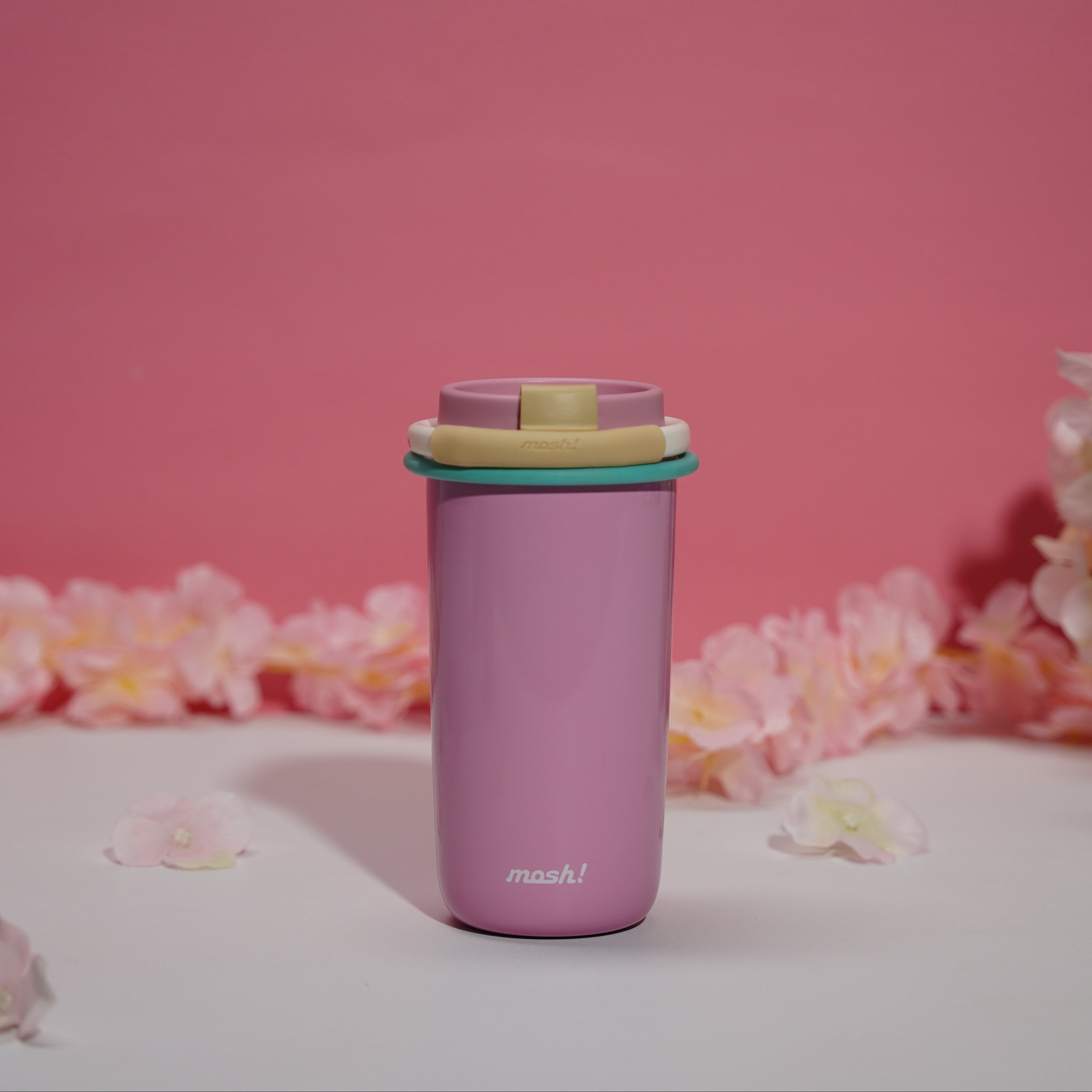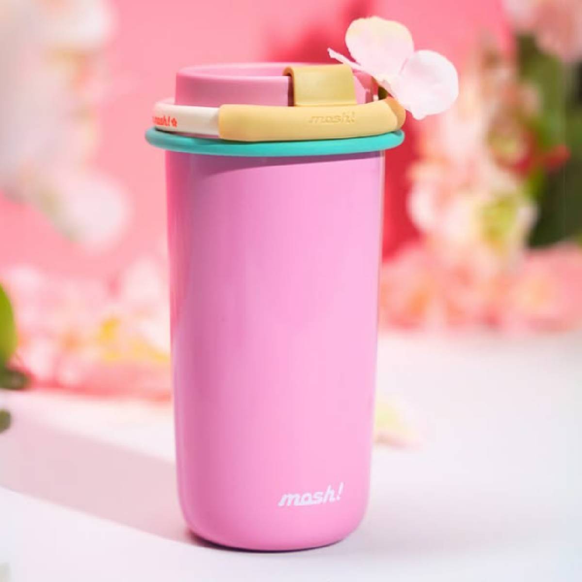 כוס תרמית בצבע ורוד מסטיק מבית מוש עם קש ותחתית סיליקון למניעת החלקה, בעיצוב נקי ומינימליסטי בהשראת כוסות ה-TA מנייר - לקפה של הבוקר בפקקים, להתרעננות אחרי אימון או בתיק ליום סידורים.