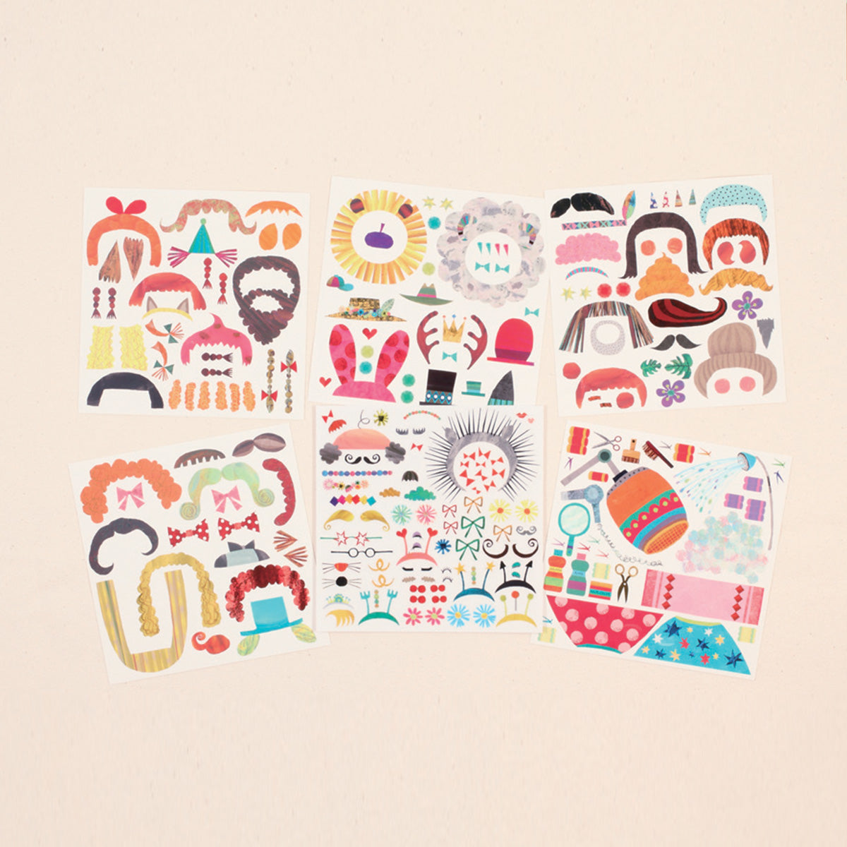 לכל איור מקסים מוסיפים את המדבקות שבוחרים – שיער ארוך או קצר, אוזניים, שפם או זקן, כובעים במגוון סוגים ועוד, בשלל צבעים וצורות – ויוצרים מכל החלקים הקטנים דמויות קצת אחרות, מוזרות ומצחיקות! 😊