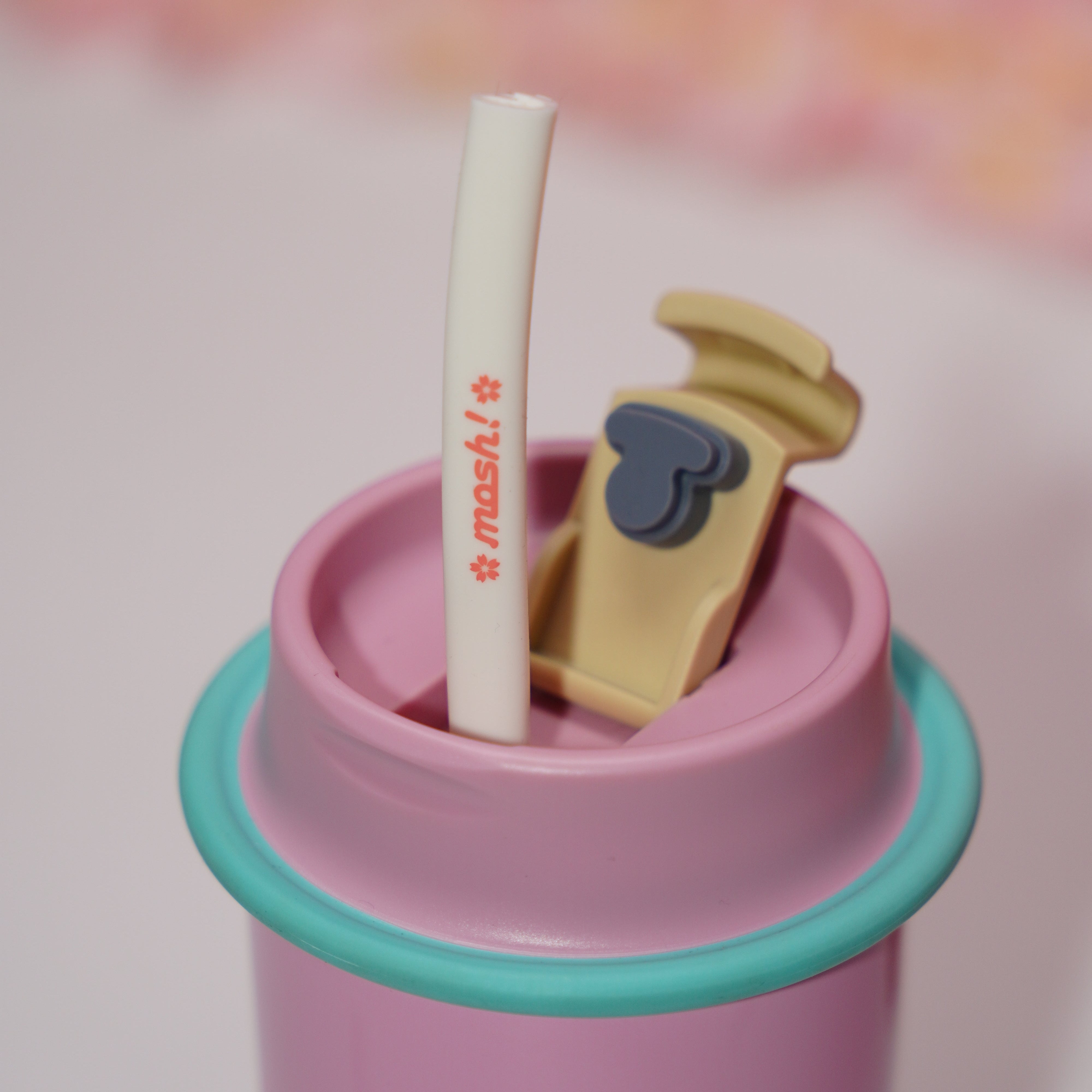 כוס תרמית בצבע ורוד מסטיק מבית מוש עם קש ותחתית סיליקון למניעת החלקה, בעיצוב נקי ומינימליסטי בהשראת כוסות ה-TA מנייר - לקפה של הבוקר בפקקים, להתרעננות אחרי אימון או בתיק ליום סידורים.