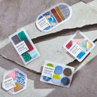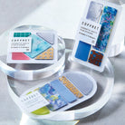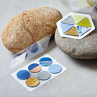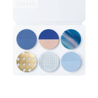 סט מדבקות שקופות של עיגולים בגוונים כחולים ומוזהבים שמזכירים אופק, שמיים וחוף ים. מתאימות להדגשה עדינה וקישוט אלגנטי של יומן, מכתב או כרטיס ברכה, אריזת מתנה או כל פריט שדורש נגיעה קטנה של צבע.