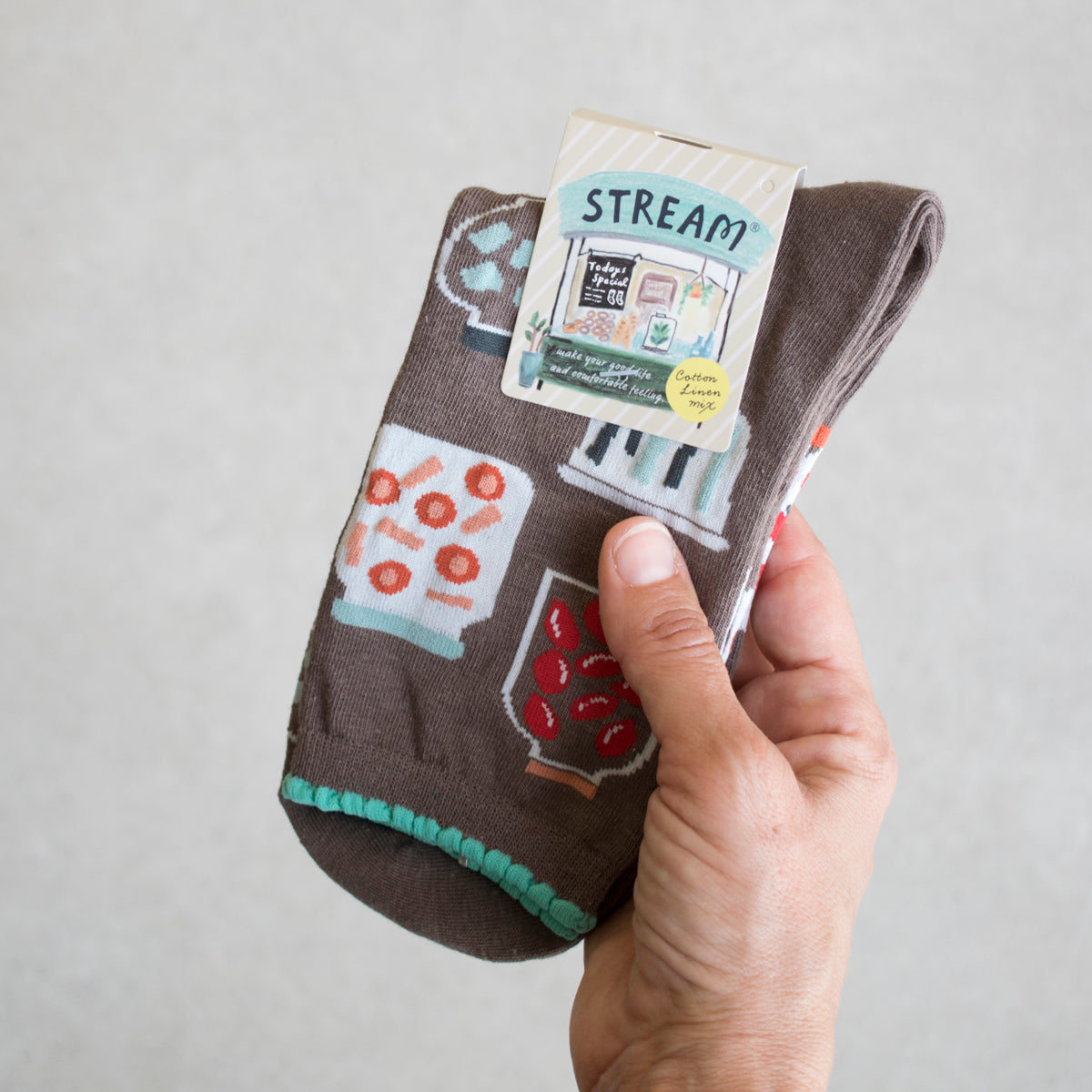 גרביים איכותיים מבית Stream יפן בדגם צנצנות, עשויים בד נעים ונושם אך עמיד מאוד, במבחר הדפסים ואיורים, טקסטורות ושילובי צבעים מעניינים.