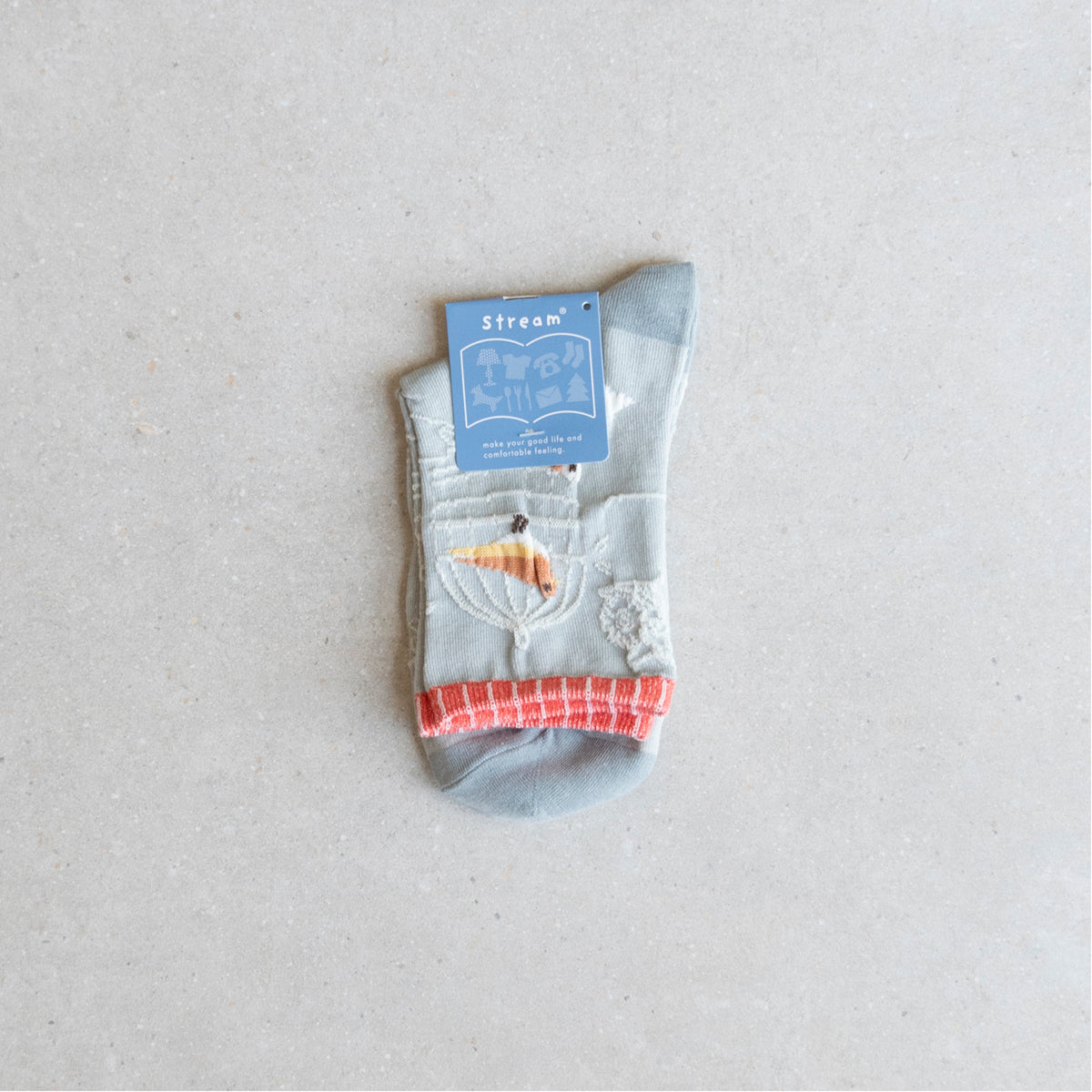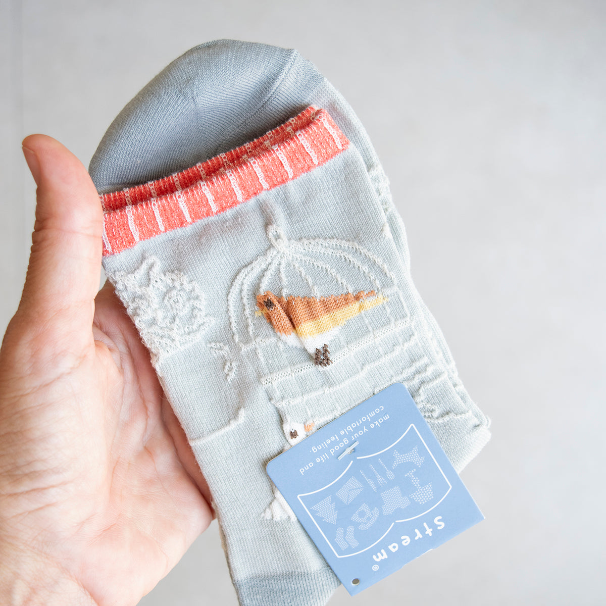 גרביים איכותיים מבית Stream יפן, בדגם ציפור בכלוב, עשויים בד נעים ונושם אך עמיד מאוד, במבחר הדפסים ואיורים, טקסטורות ושילובי צבעים מעניינים.