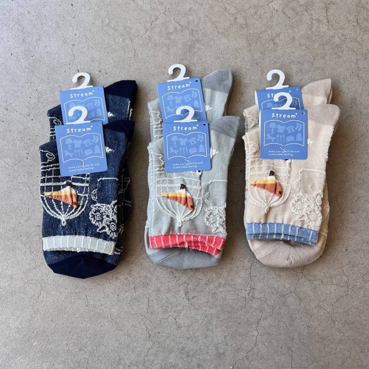 גרביים איכותיים מבית Stream יפן, בדגם ציפורים, עשויים בד נעים ונושם אך עמיד מאוד, במבחר הדפסים ואיורים, טקסטורות ושילובי צבעים מעניינים.